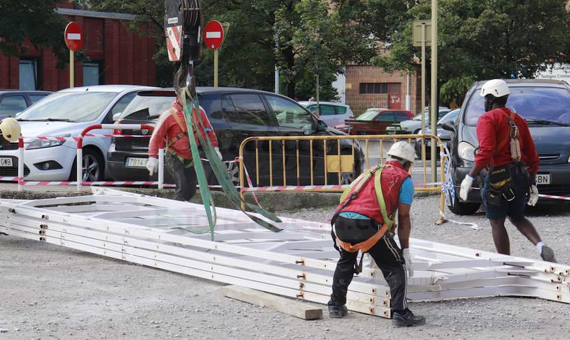 A primera hora de la mañana de este jueves 22 de agosto, tres grúas y varios operarios han continuado con el desmontaje de la noria gigante de las Fiestas de la Virgen Grande de Torrelavega, ubicada en un solar entre varios edificios.
