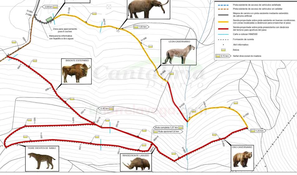 En el proyecto se prevén esculturas y paneles con información sobre animales cuaternarios como el tigre dientes de sable, el mastodonte y el bisonte estepario, entre otros.