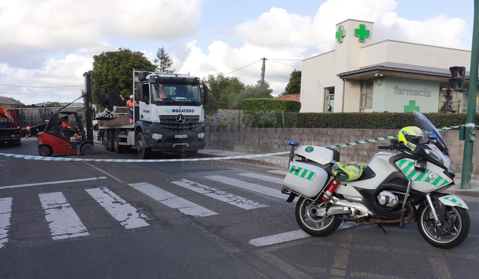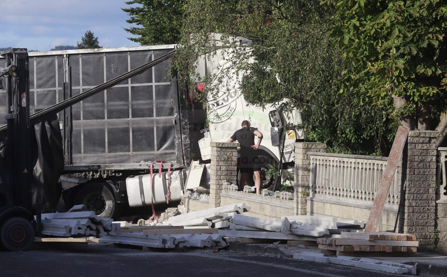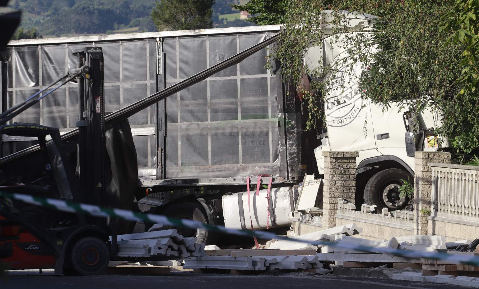 El camión accidentado ha bloqueado todo el tráfico de la carretera, a la altura de la farmacia, un tráfico que a las 20.38 horas todavía permanece cortado mientras se realizan tareas para sacar el camión empotrado en el muro de la vivienda.