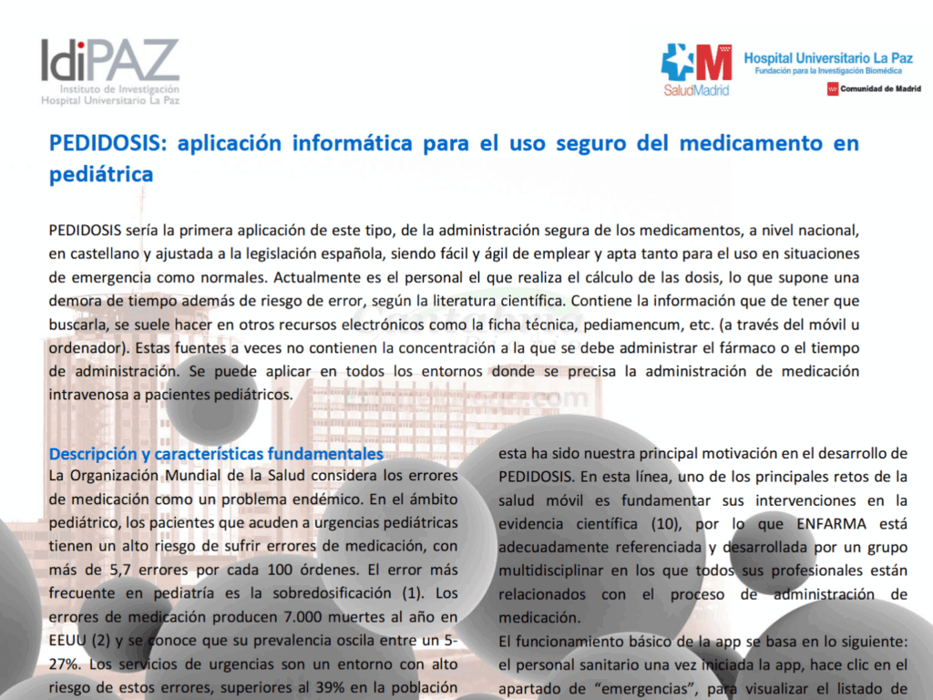 Una de esas páginas afectadas es la aplicación sanitaria PEDIDOSIS, vinculada al Instituto de Investigación del Hospital Universitario La Paz de Madrid, y cuya función es «optimizar la seguridad del paciente con un documento de consulta de fármacos de uso frecuente por vía parenteral» y disponer de un recurso ágil y actualizado en el momento de la administración de fármacos en Pediatría, para el personal de enfermería.
