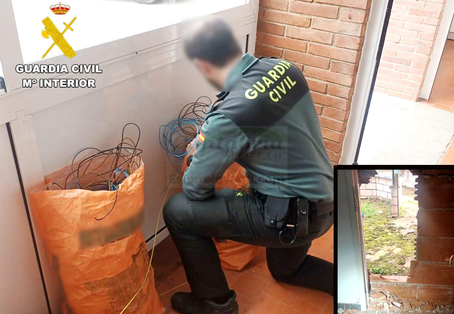 Una vez en la propiedad, en la entrada a una vivienda que había sido tapiada, habían originado una apertura fracturando parte de los ladrillos. Los agentes se introdujeron por dicha abertura sorprendiendo a una persona introduciendo cables dentro de un saco. Dicho cableado de cobre procedía de la instalación de la vivienda.