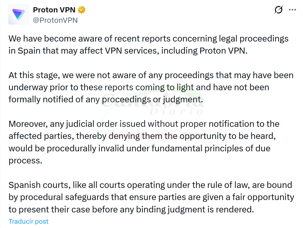 «Además, cualquier orden judicial emitida sin la debida notificación a las partes afectadas, negándoles así la oportunidad de ser escuchadas, sería procesalmente inválida en virtud de los principios fundamentales del debido proceso», apunta Proton VPN.